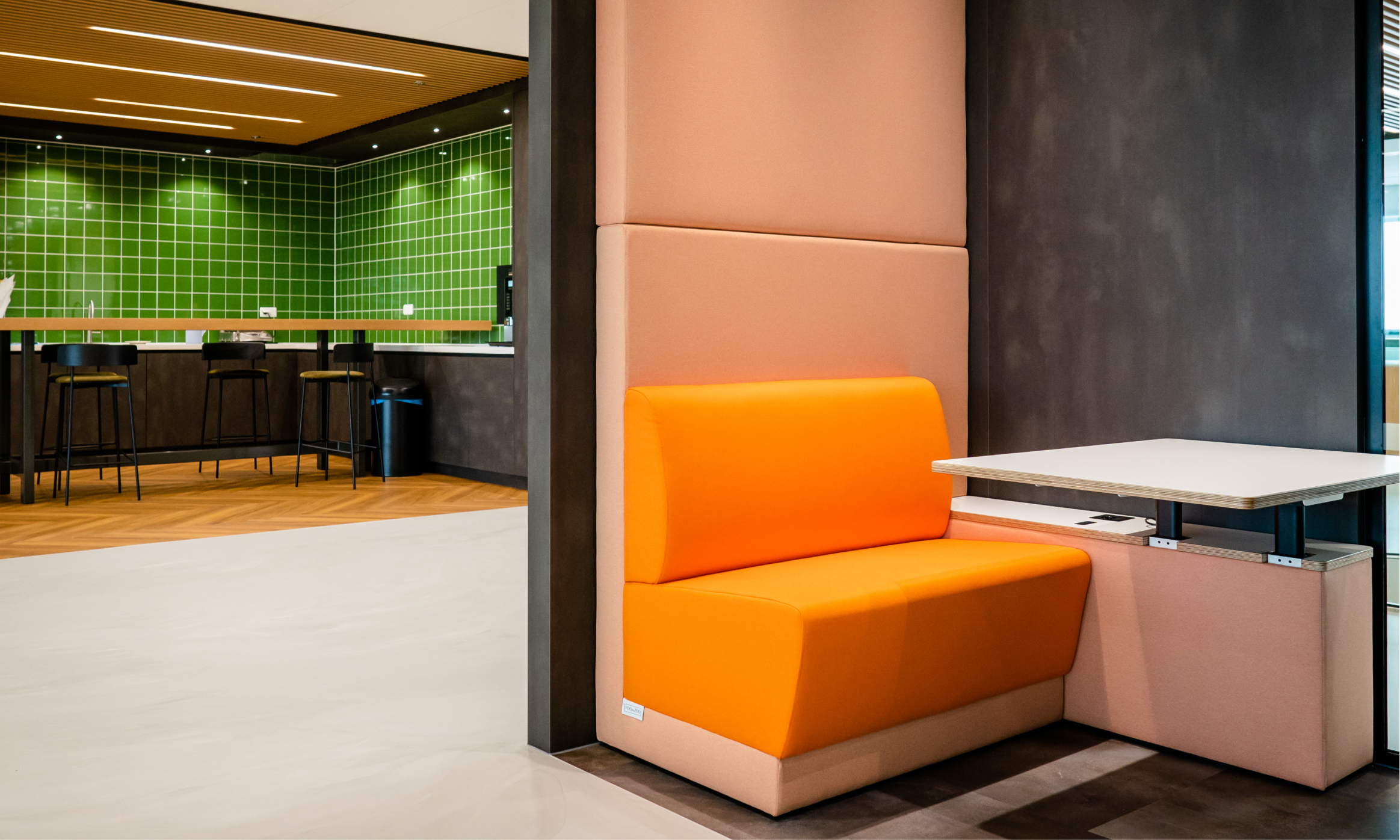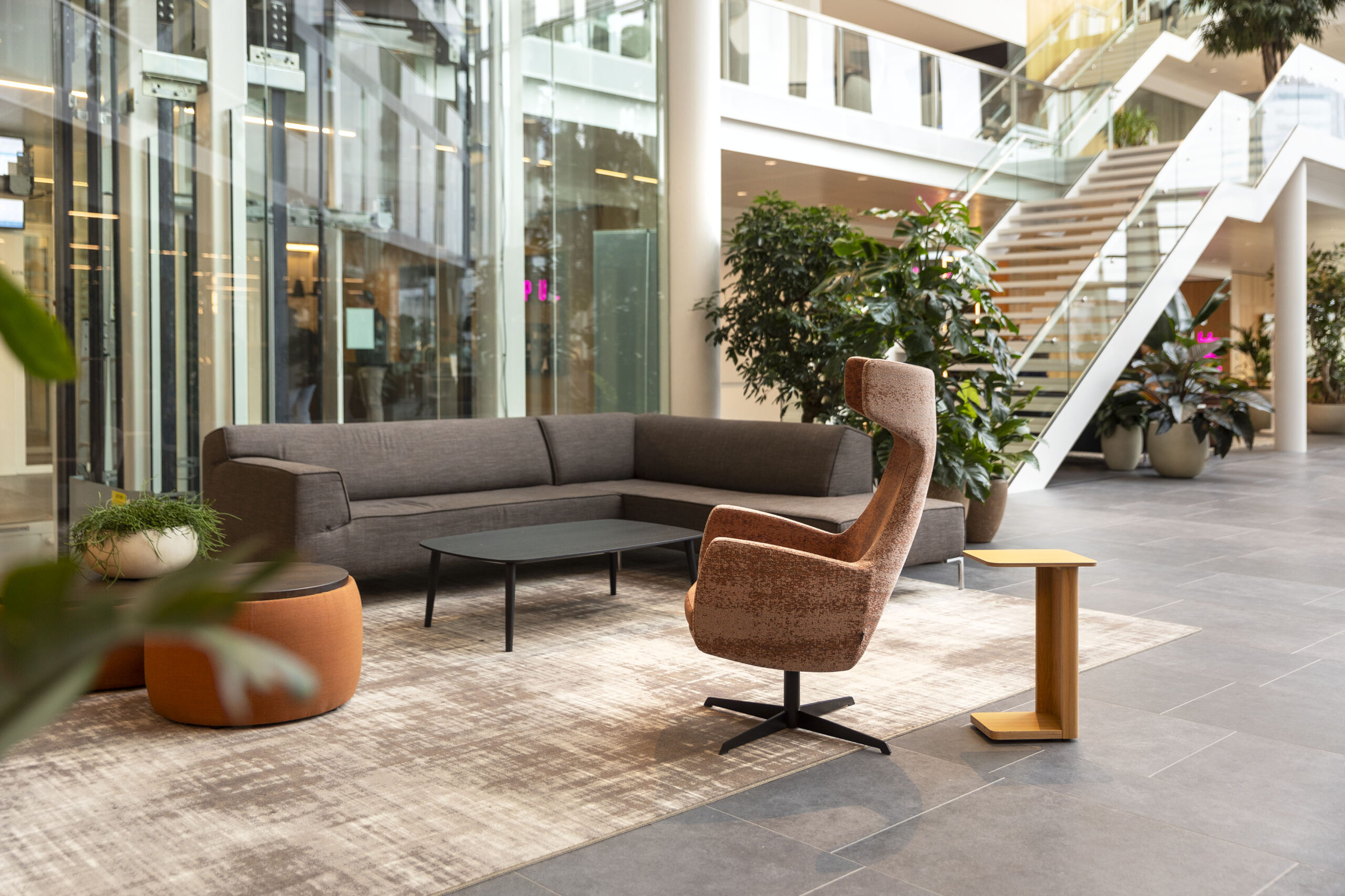 In het ontwerp hielden we rekening met comfort, akoestiek en beleving. Geluidsabsorberende elementen zorgen voor rust, terwijl groene accenten, houttinten en lichte kleuren de sfeer versterken. Verschillende meubeltypes en opstellingen dragen bij aan de flexibiliteit van de ruimte. Kleine zitjes met lange tafels nodigen uit tot ontmoeting, overleg en training. Uiteraard met volop ruimte om producten uit te proberen.